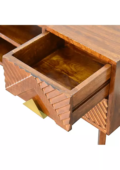 This striking Alma Media Unit has been made from 100% solid mango wood in a chestnut finish and offers a striking ridged design surrounded by a brass inlay diamond. Other features include 2 large open slots and nordic style legs. Place a TV, a turntable or a favorite art piece on top and enjoy your new, contemporary living room.