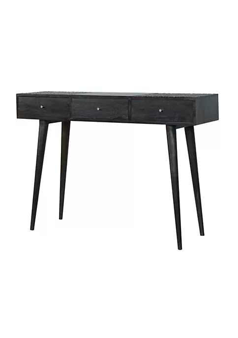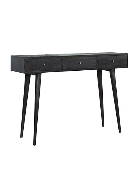 This console offers excellent storage with 3 large drawers. Perfect for use in the living room or hallway it will come in handy when storing bits and pieces you wish to keep out of sight as well as things you wish to display on the top. Constructed from 100% solid mango wood in an ash black finish it features Nordic style legs and chrome coated knobs.