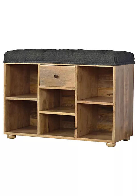 This smaller shoe storage bench is a practical piece of country furniture that will fit beautifully in your hallway. It is constructed from 100% solid mango wood and has a fine oak-ish finish with a seat upholstered in black tweed. Other features include 1 drawer which comes with a shiny knob, 4 bun feet and 6 open shelf units to store your shoes. Every piece of furniture is individually handcrafted and includes swing care tickets explaining the cautions and aftercare instructions.
