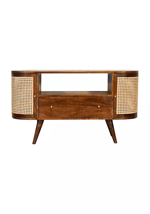 This stylish Nordic Woven Media Unit combines 2 woven cabinets with a smooth chestnut finish body and legs. Constructed from 100% solid mango legs it has a shiny brass knob on the drawer and nordic style legs. Make full use of this media unit in the living room and partner it with the rest of the collection.
