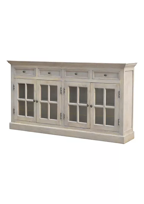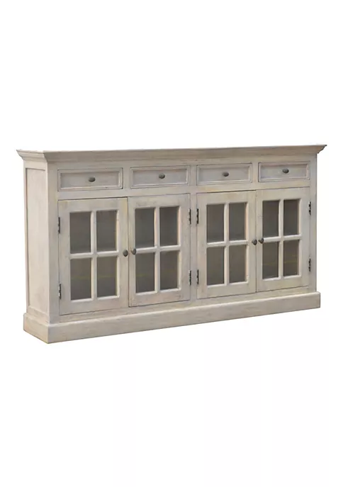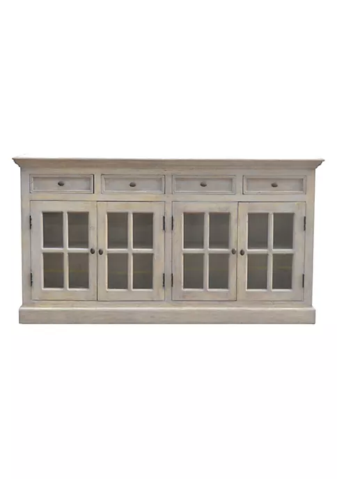 This country sideboard is constructed from 100% solid mango wood which is meticulously hot dipped using a laborious caustic wash technique. This lengthy multi stage finishing process gives a beautiful weathered and aged acid washed finish. It comes with 4 glazed doors with shelves inside and 4 drawers; to place things such as special ornaments, pictures etc. The door cabinets and drawers come with shiny, round knob handles.