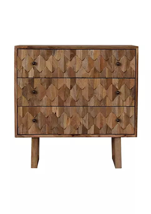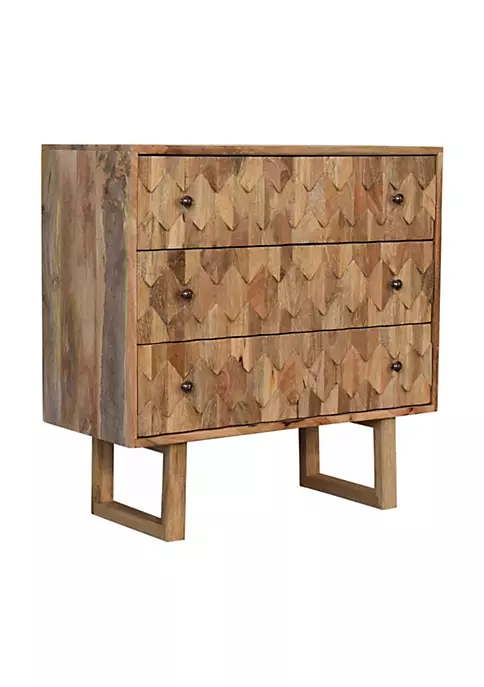 This chest is alive with personality allowing you to create a cozy environment. It is made from 100% solid mango wood in a oak-ish finish and will meet all your expectations of a chest. Its lovely pattern will give your home a modern vibe as well as providing 3 spacious drawers for convenience. It has been constructed from 100% solid mango wood in an oak-ish finish.